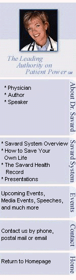 "I don't know how I have lived so long without this book! I truly believe that Dr. Savard's book, "How to Save Your Own Life" should be required reading for anyone who cares about their health. Ever since my mother became sick a year ago, I have realized how important it is for us to be in control of our medical care. This book, along with The Savard Health Record makes what could be a daunting process very simple. Thank you, Dr. Savard, for your thoughtful contributions to my peace of mind." - A reader from Greenwich, CT